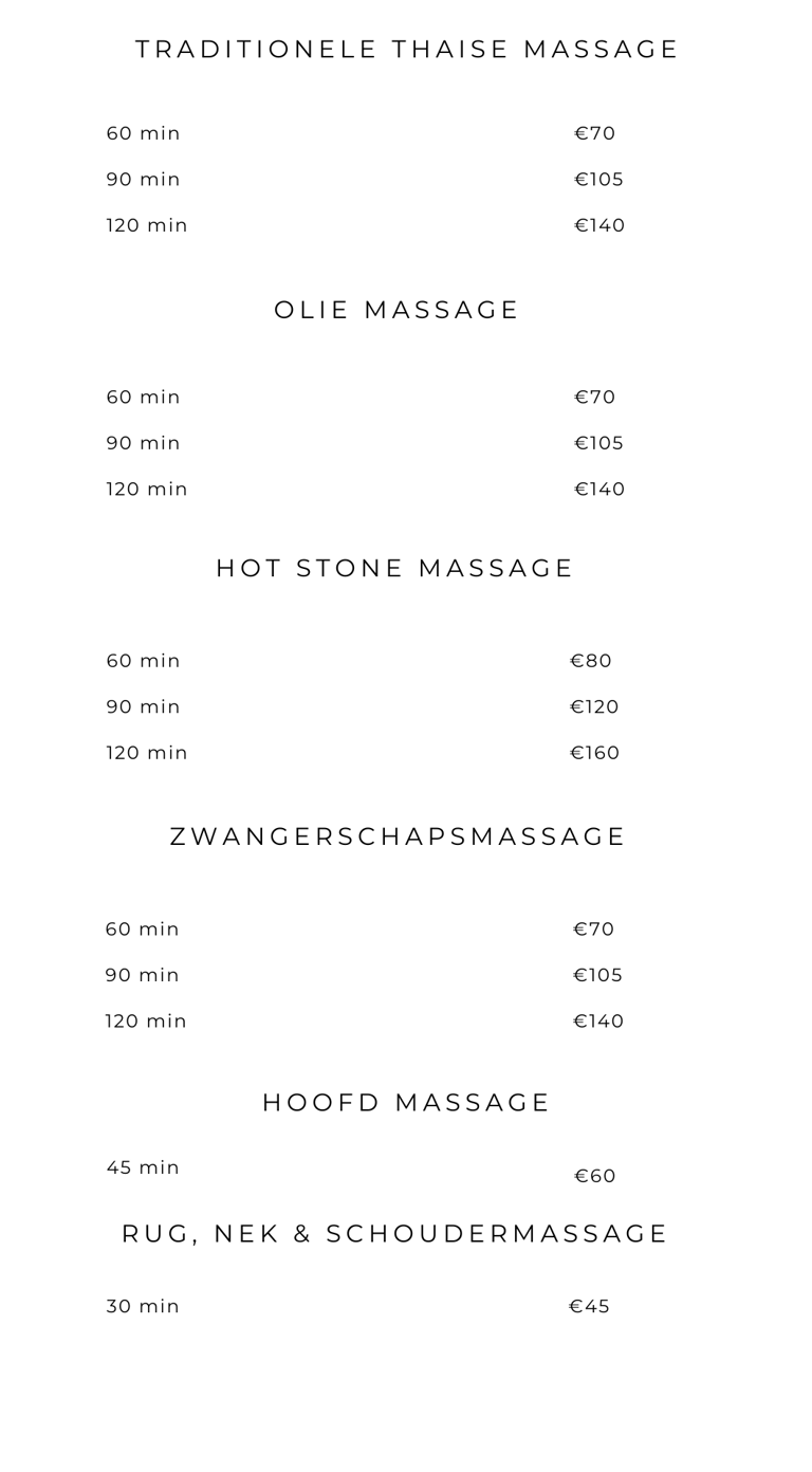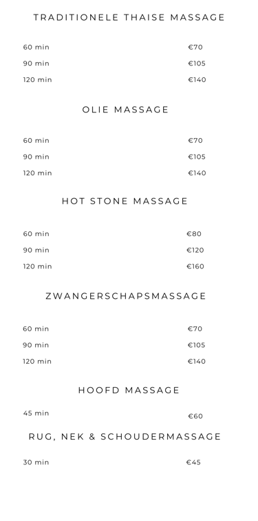 Wij bieden traditionele Thaise massage, oliemassage, kruidenstempelmassage en ontspanningsmassages aan. Elke behandeling wordt aangepast aan jouw wensen en klachten.