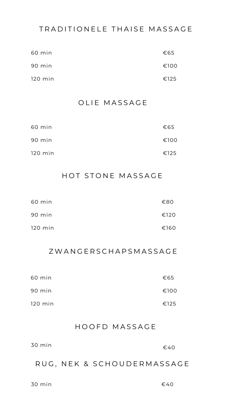Wij bieden traditionele Thaise massage, oliemassage, kruidenstempelmassage en ontspanningsmassages aan. Elke behandeling wordt aangepast aan jouw wensen en klachten.
